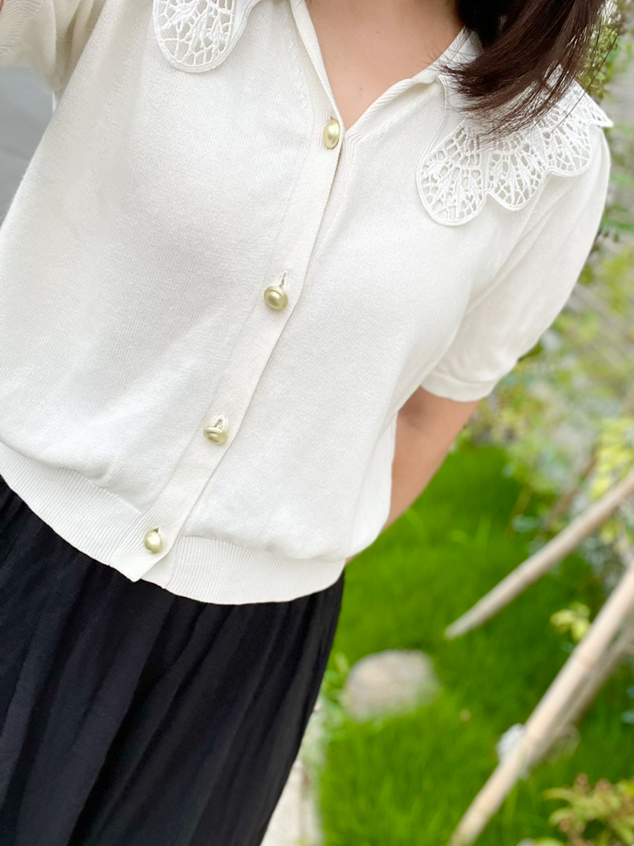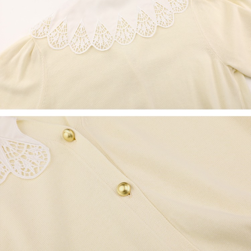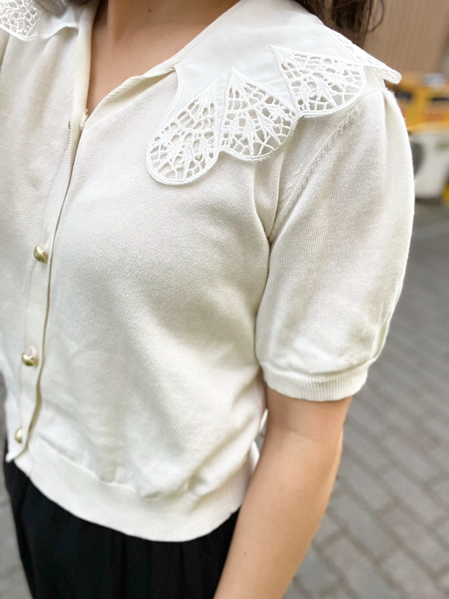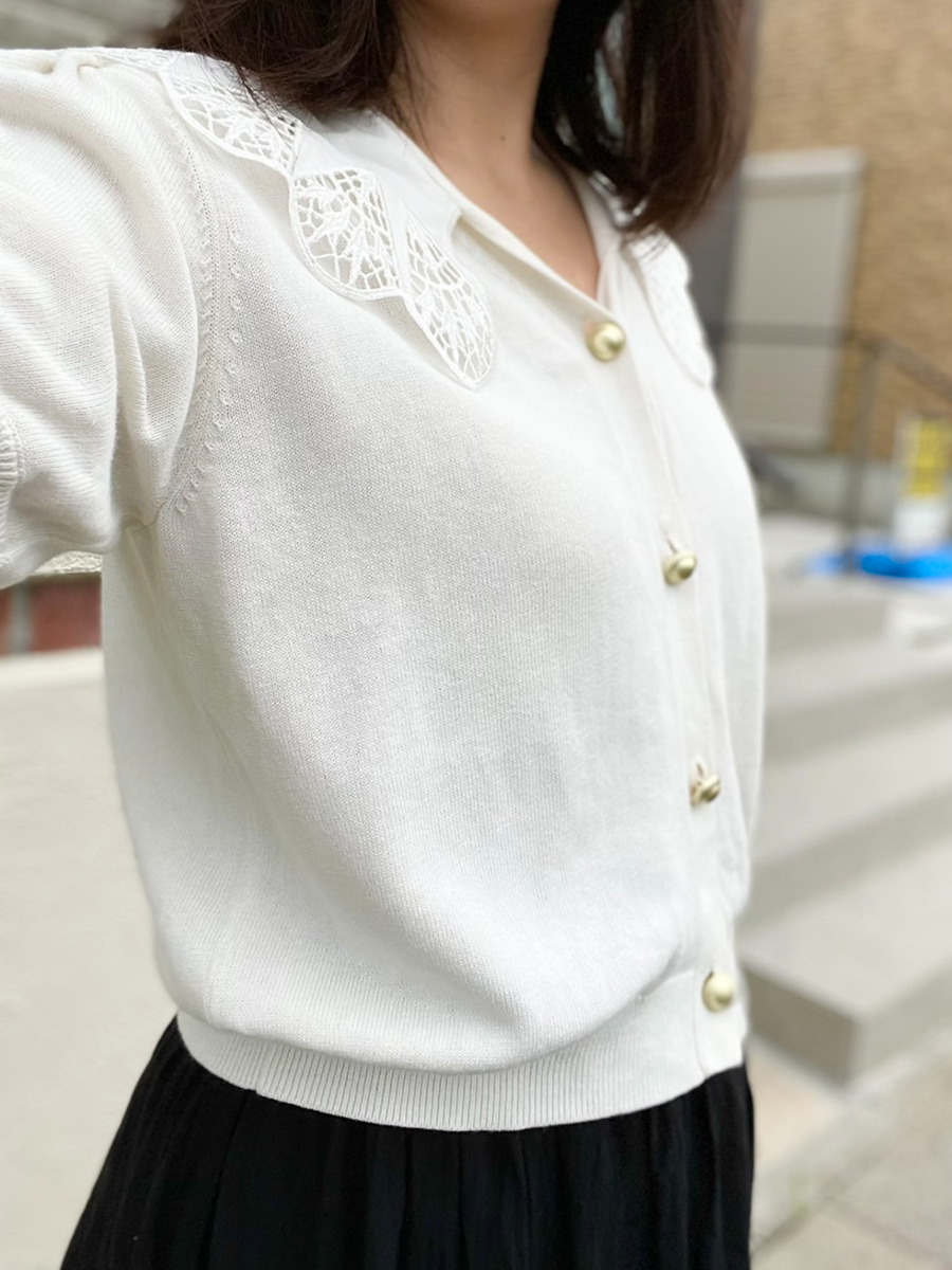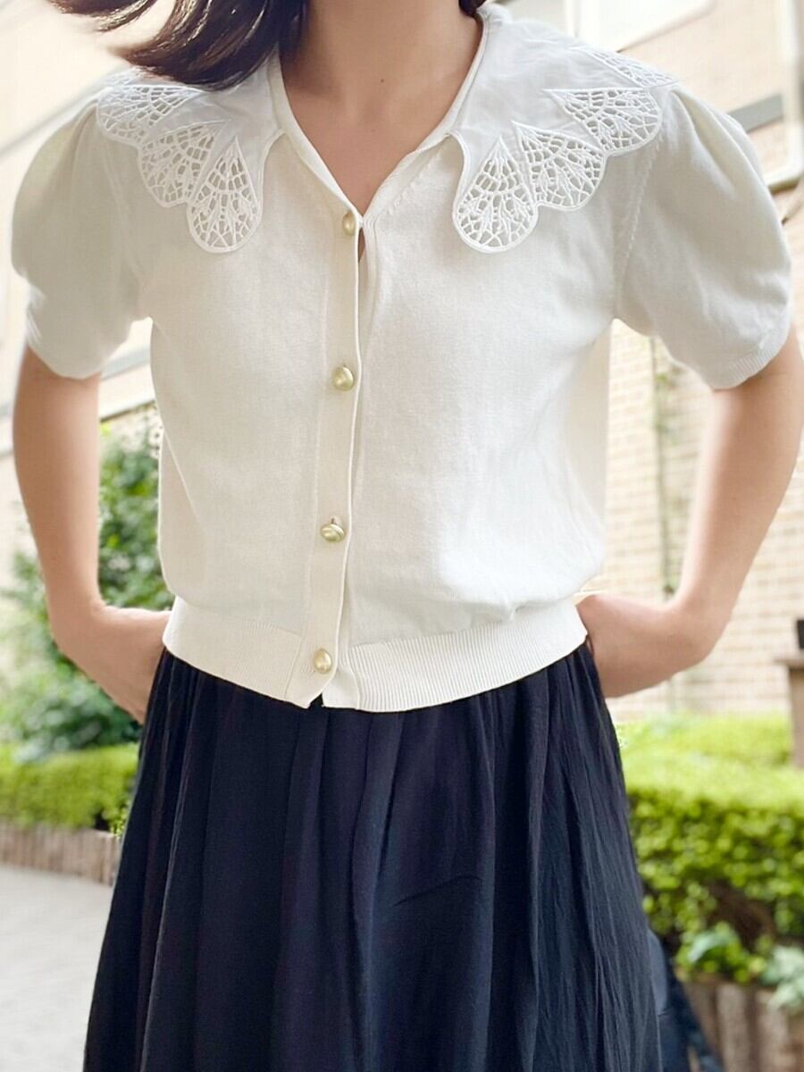 レース調の襟と、ゴールドのボタンがかわいさを引き立てます。