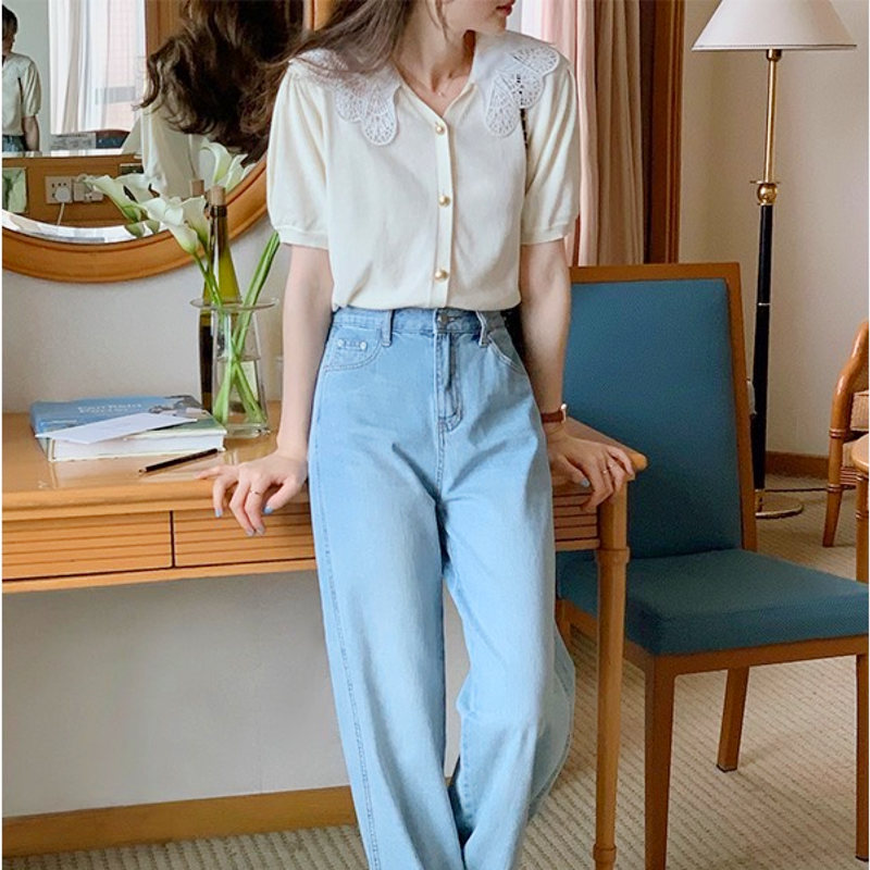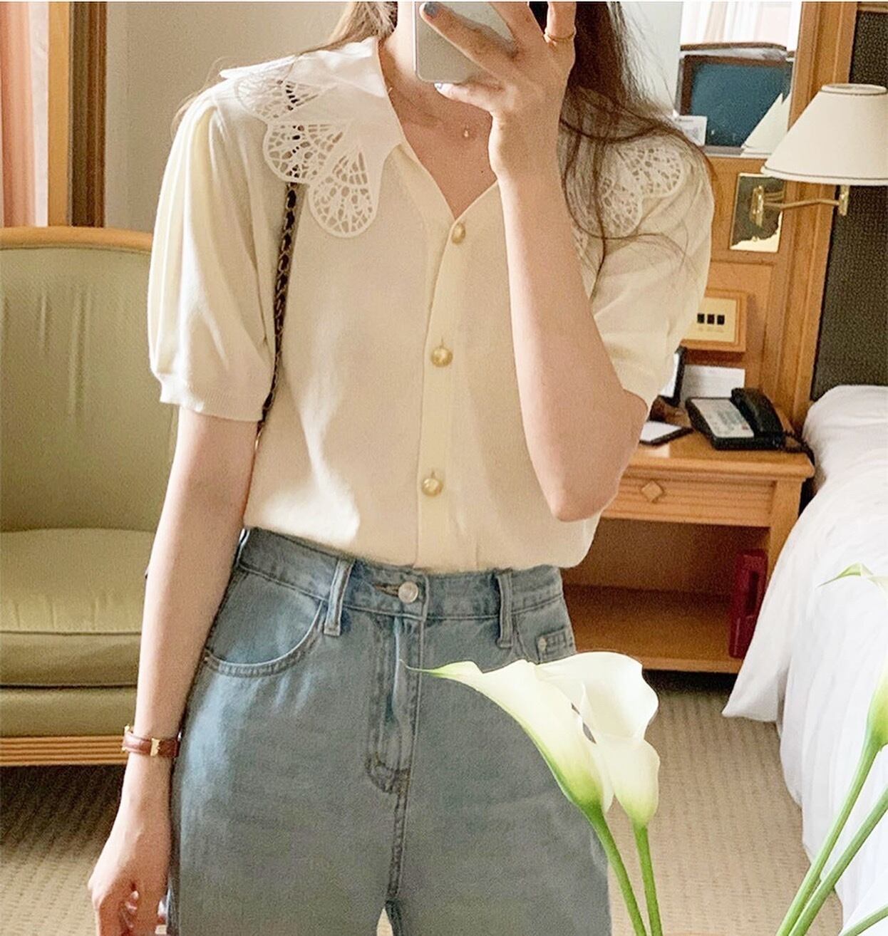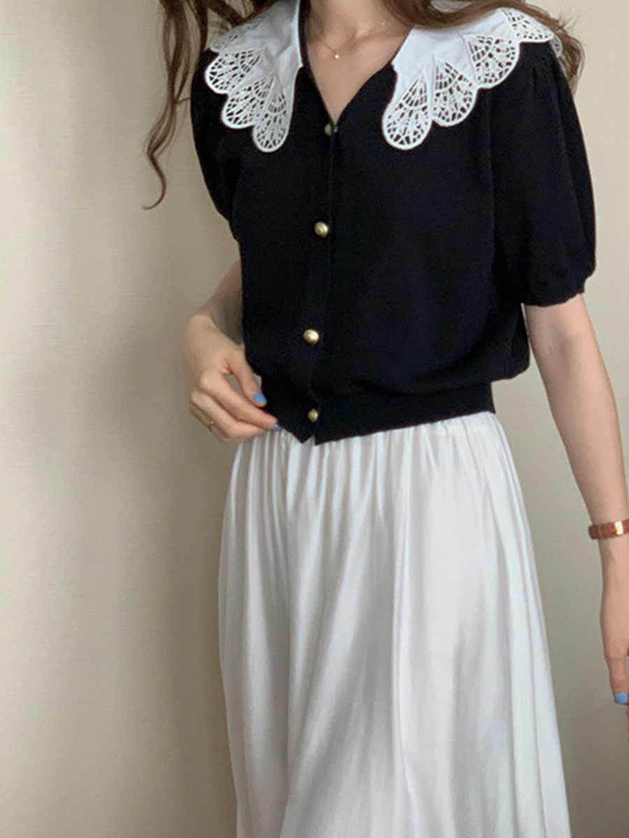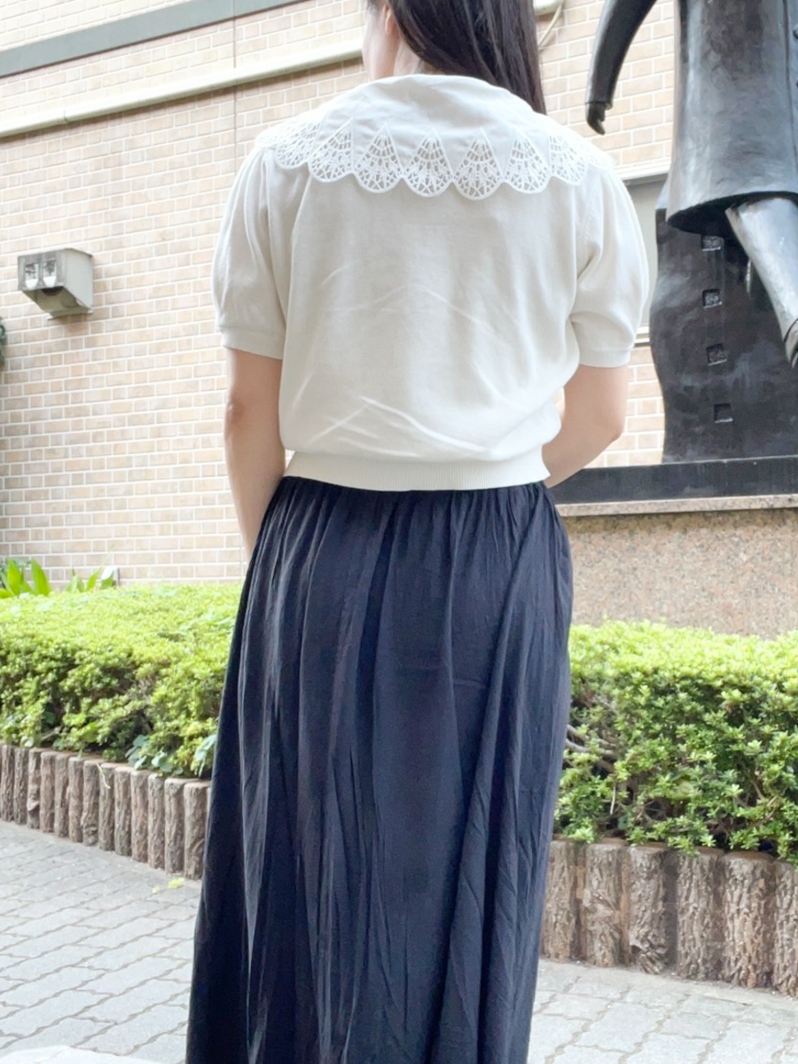 レース調の襟と、ゴールドのボタンがかわいさを引き立てます。